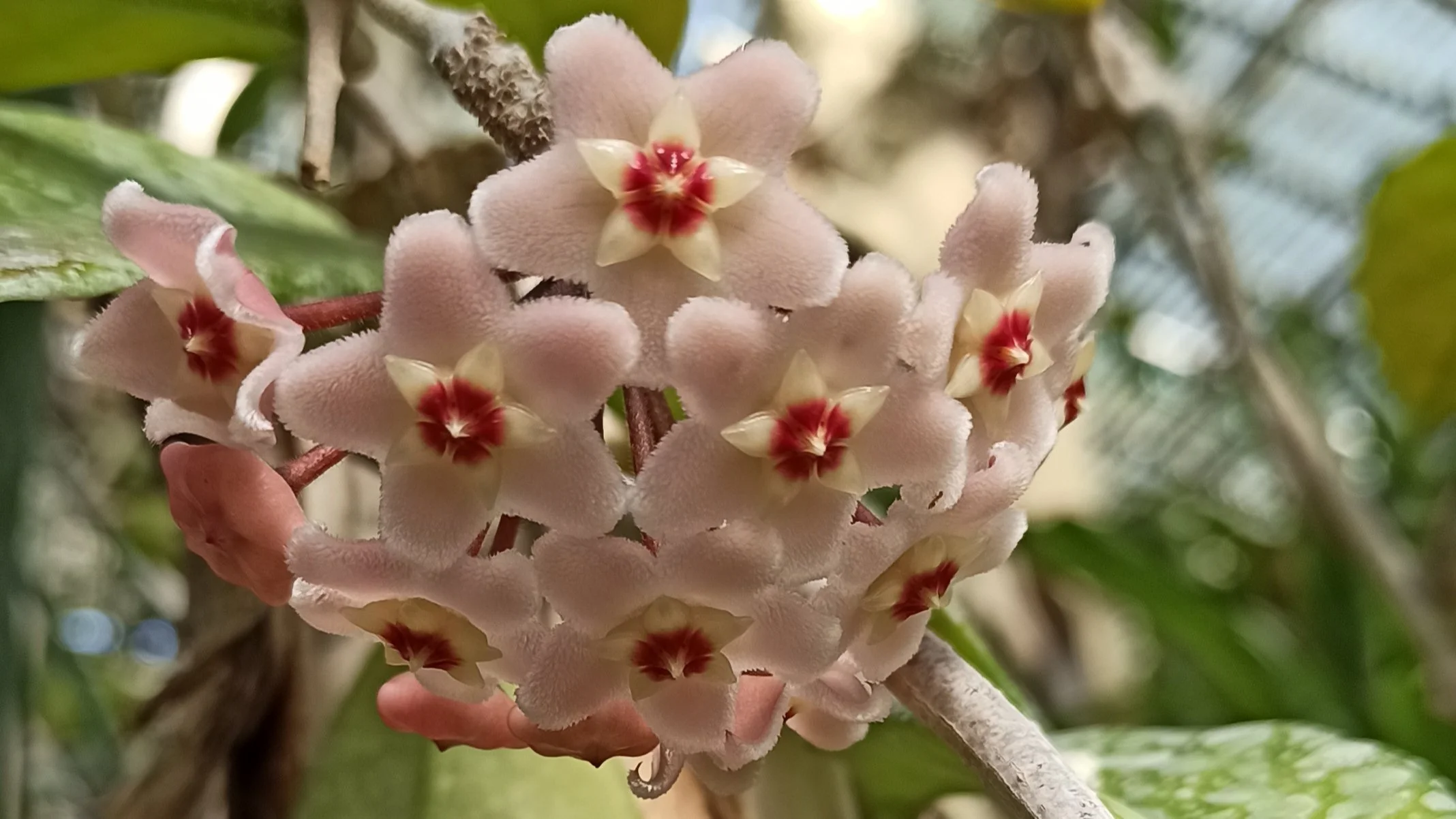 Hoya Carnosa (Apocynaceae) aux fleurs dites de porcelaine ou de cire dans les serres d’Auteuil à Paris.