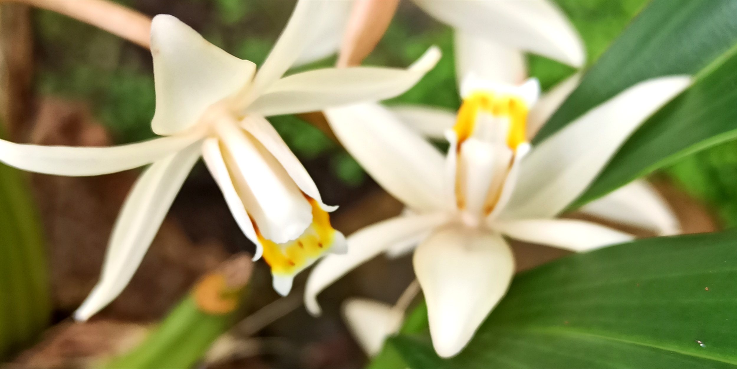Sublimes fleurs en grappe de Coelogyne massangeana (Orchidaceae) originaire d’Indonésie dans la serre des montagnes tropicales humides du CBN de Brest.