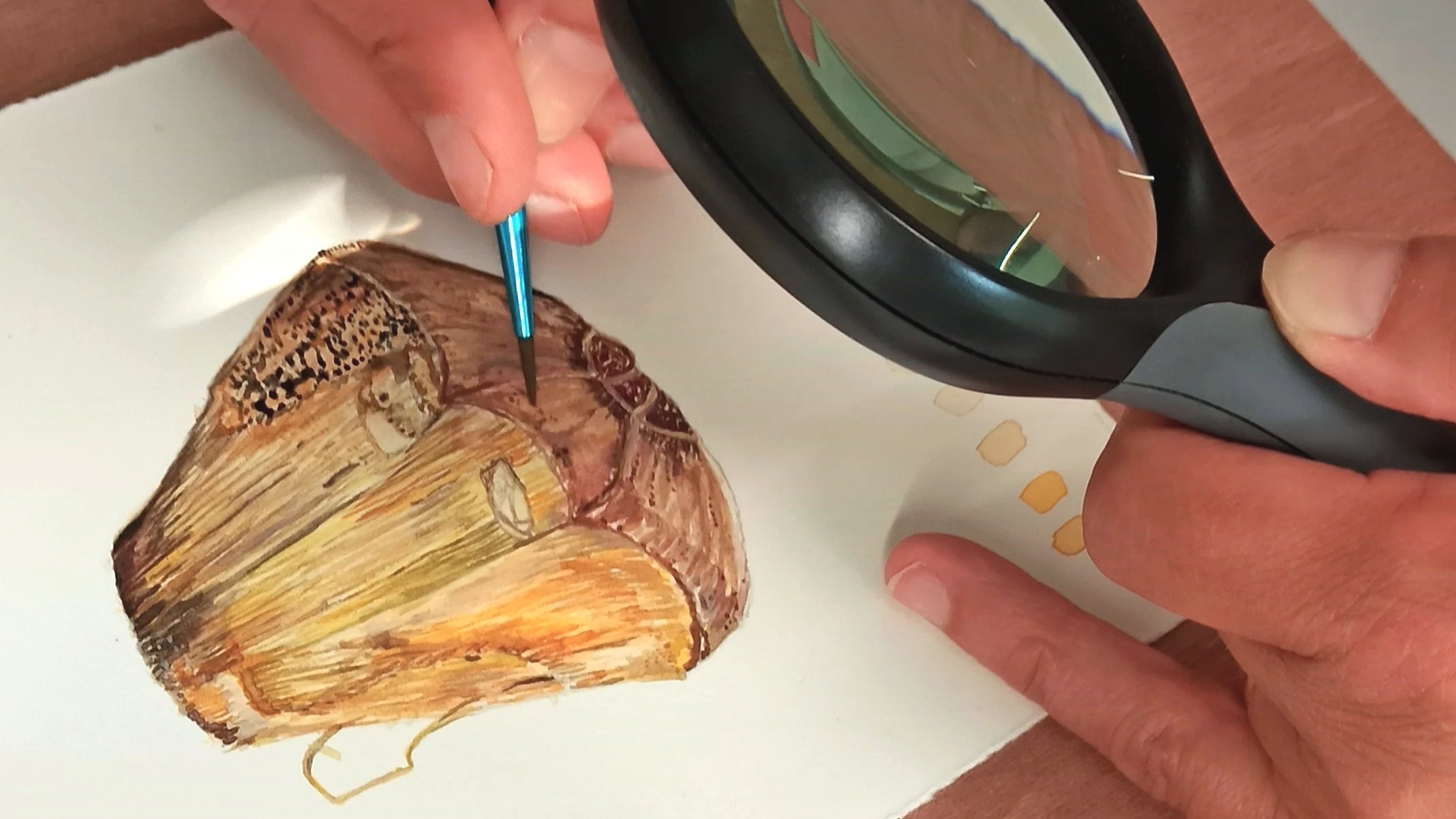 Stagiaire explorant le vocabulaire pictural à l’aquarelle sur une graine pimpin (Pandanus utilis Bory).
