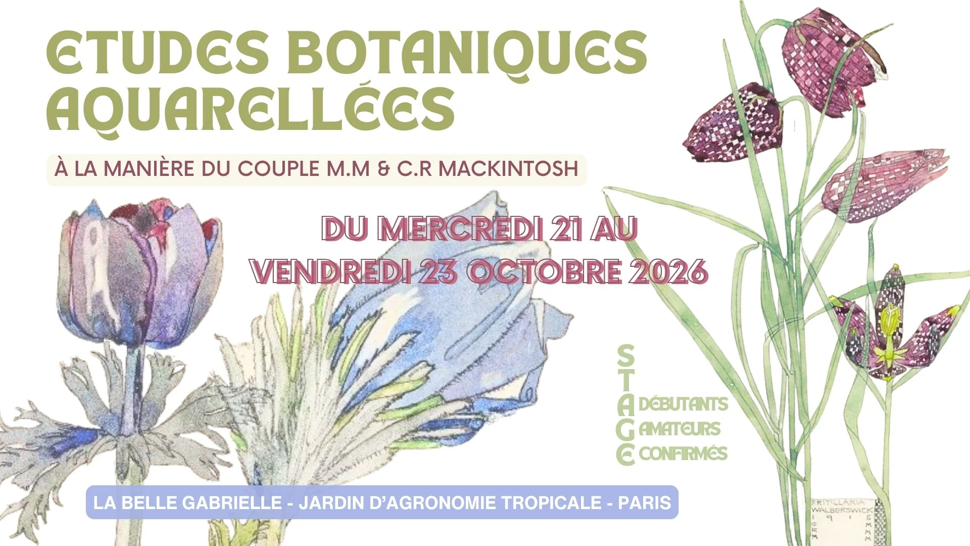 Au regard des admirables et gracieuses études botaniques du couple Mackintosh, vous apprenez à observer et sélectionner les caractéristiques d’une plante, à explorer les jeux et les possibles d’un habile mariage de la couleur et de l’écriture graphique et à élaborer la composition d’une élégante esquisse créative.