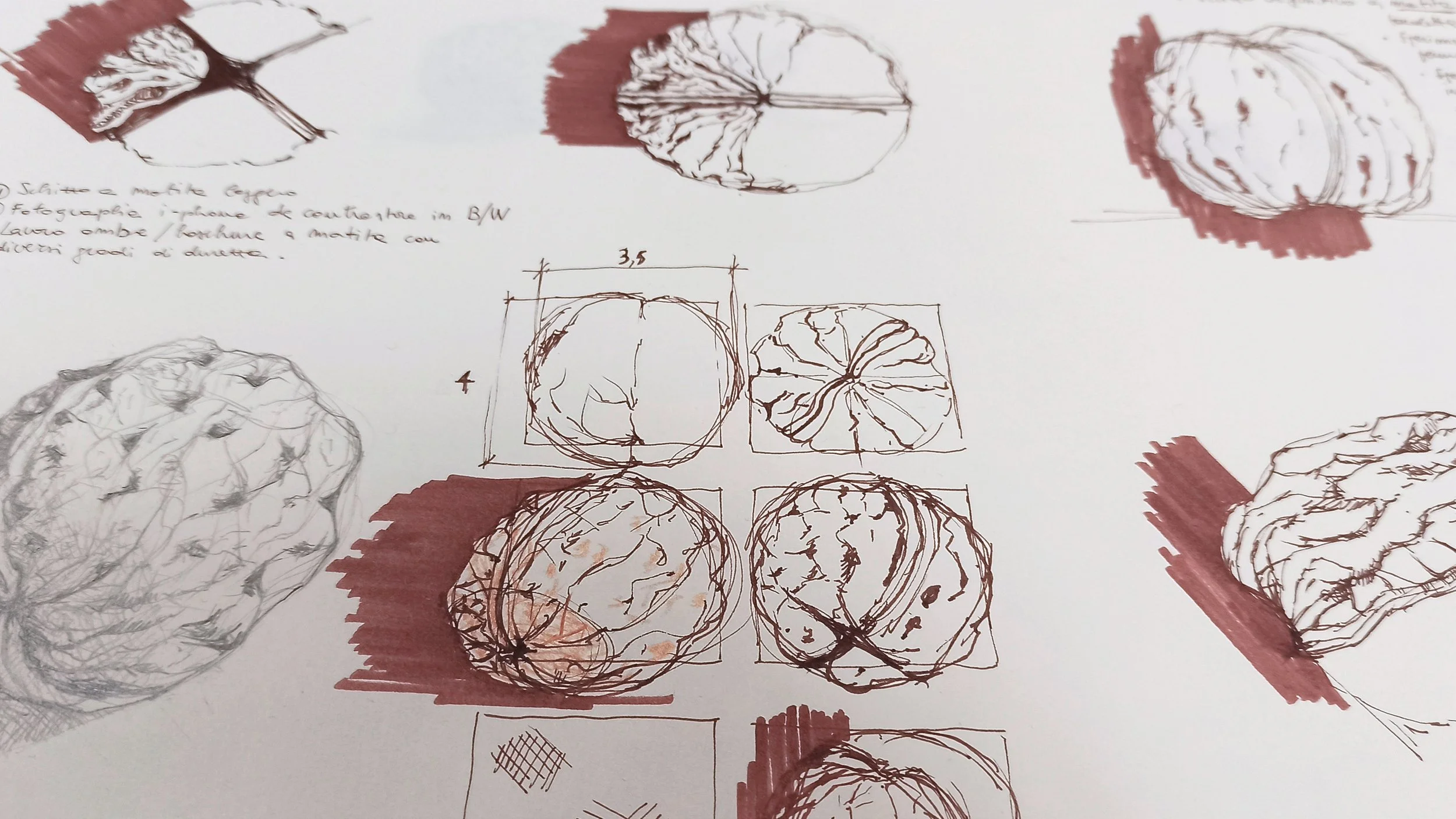 Explorations et variations graphiques d’une noix par une stagiaire, lors de la formation Dessin botanique 40h Paris.